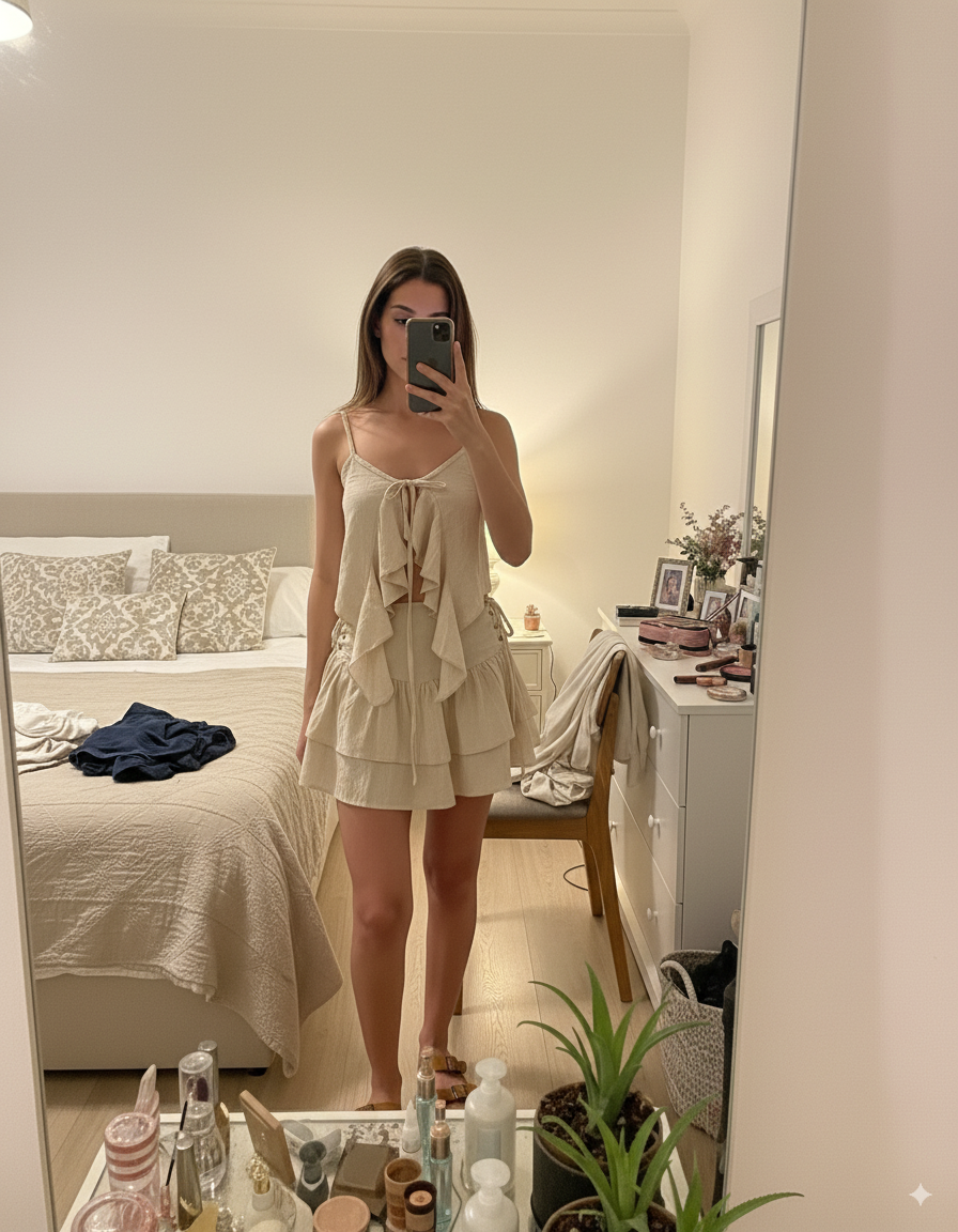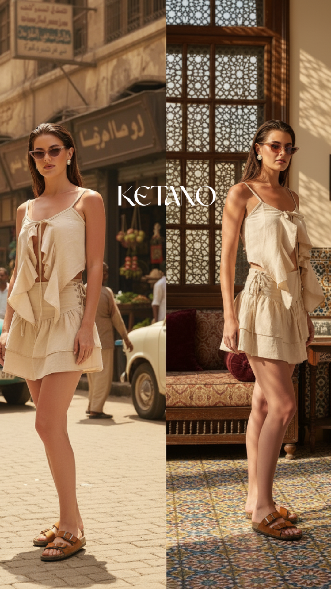 The Celeste Set — lightweight, romantic, and endlessly versatile. Crafted from 100% Egyptian linen to keep you cool in the heat and chic in the evening.